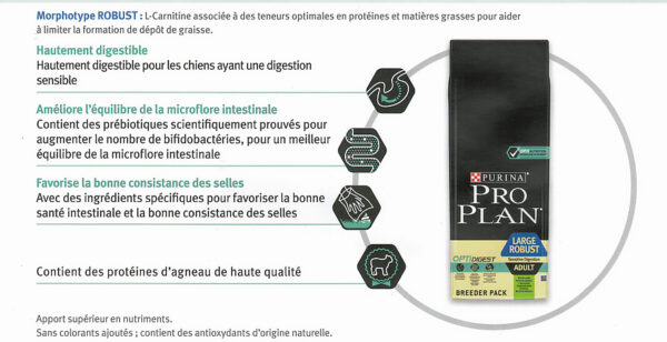 Aliment complet pour chiens adultes de grande taille de morphotype robuste ayant une digestion sensible. OPTIdigest™ contient de la bentonite, une argile naturelle qui lie l’excès d’eau afin de favoriser la bonne consistance des selles, et des prébiotiques, scientifiquement prouvés pour aider à améliorer l’équilibre de la microflore intestinale.