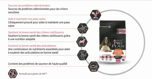 Aliment complet pour chiens de moyenne ou grande taille de plus de 7 ans ayant une peau sensible. OPTIderma™ contient une combinaison spéciale de nutriments, cliniquement prouvée pour aider à maintenir une peau en bonne santé et un beau pelage, ainsi que des sources de protéines sélectionnées pour aider à réduire les réactions cutanées associées à des sensibilités alimentaires.