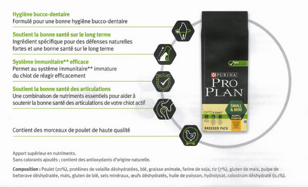 Proplan PUPPY SMALL & MINI riche en poulet est un aliment pour chiots de petites et mini races. Il est riche en protéines de poulet pour aider à construire et maintenir la masse musculaire maigre. Il contient également des niveaux élevés d’acides gras oméga pour une peau et un pelage en bonne santé, ainsi que des antioxydants pour renforcer le système immunitaire. Cet aliment est formulé pour répondre aux besoins nutritionnels spécifiques des chiots de petites et mini races et peut aider à soutenir leur croissance et leur développement.